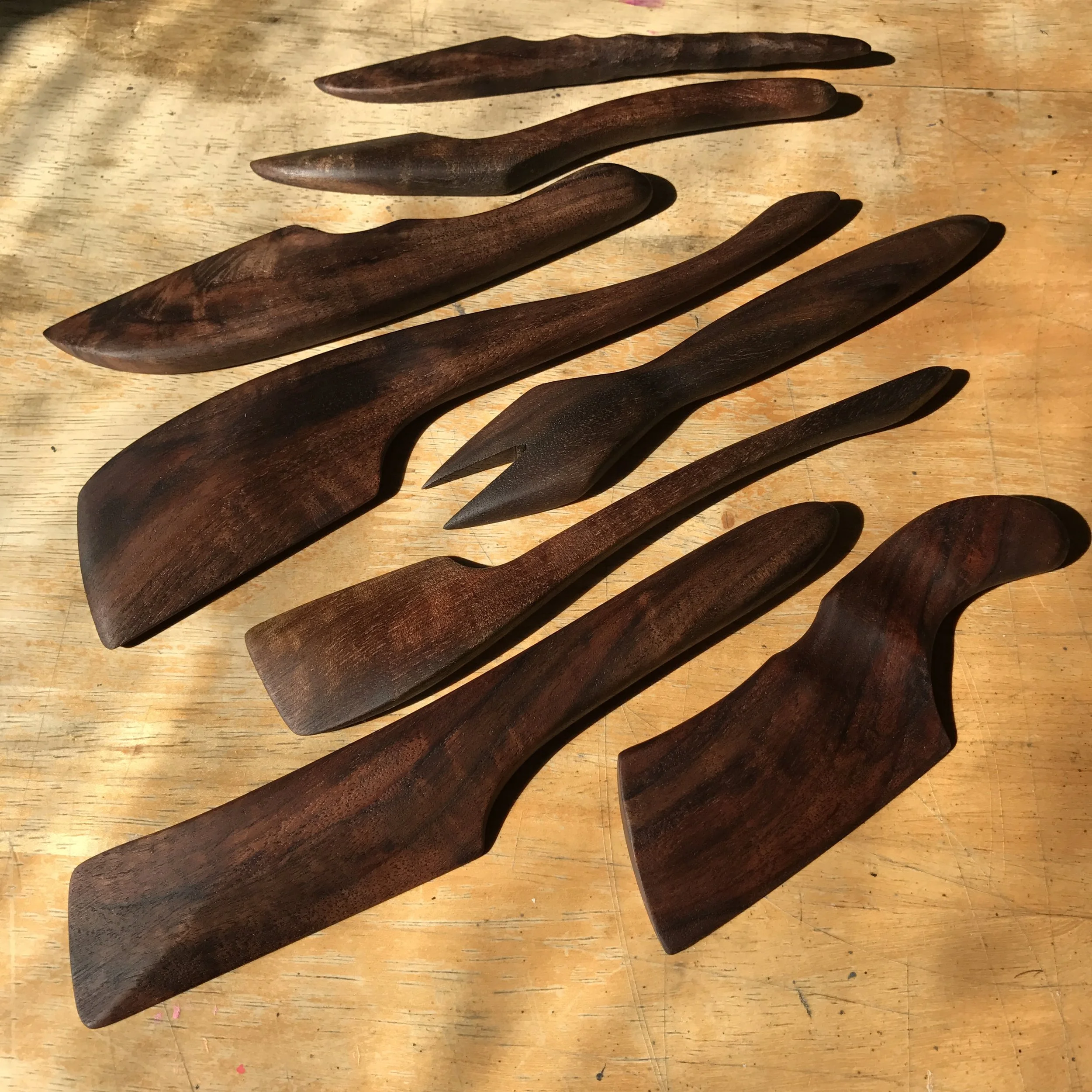 Sculpted wood climbing holds, some made from repurposed or recycled materials